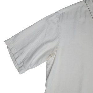 This Caribbean Blue Marlin Beach Scene short sleeve button-down shirt is a perfect blend of silk and cotton. It exhibits a cream-colored backdrop, adorned with a stunning Caribbean scene in size M.