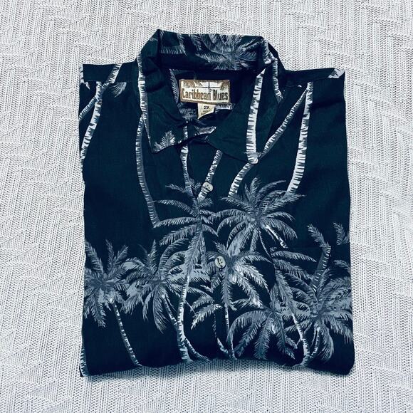 Caribbean Blues palm tree print short sleeve button down, size XXL. Perfect Florida vacation or cruise vacation shirt. Recently professionally dry cleaned. Previously loved and in excellent condition. Non smoking and pet free house.