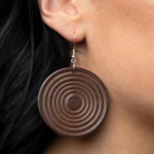 A shiny brown wooden disc is engraved in circular details, resulting in a dizzying pop of color. Earring attaches to a standard fishhook earring.