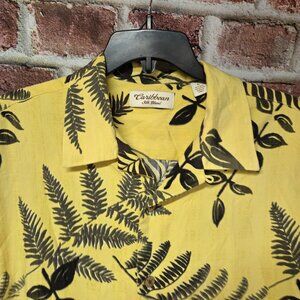 Caribbean Hawaiian Shirt L | Vintage Silk Blend Tropical Button Down Yellow