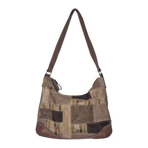 This Caribbean Joe hobo shoulder bag features a charming patchwork design in earthy brown tones, offering a rustic and handcrafted appeal. The slouchy shape and single wide strap make it a comfortable and stylish choice for everyday use. Its unique texture and asymmetrical pattern add a touch of individuality to any outfit.