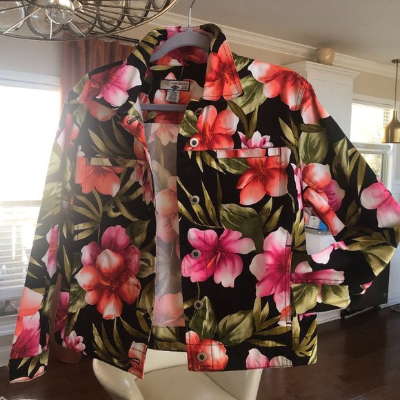 Vibrant floral jean jacket by Caribbean Joe. Features bold pink and red flowers with green leaves on a black background. Stylish and eye-catching design.