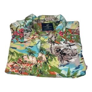 Caribbean Joe Hawaiian Shirt Large Rayon Palm Trees Huts Luau Tropical