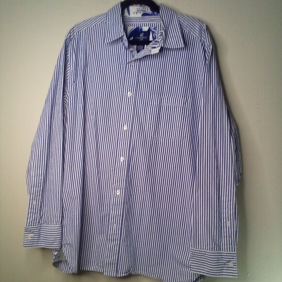 Set sail in style with the Caribbean Joe Men's XL Button-Up Shirt, featuring a classic nautical striped pattern in blue and white. Ideal for those who appreciate a touch of seaside charm in their wardrobe, this shirt brings together comfort and a timeless marine-inspired design. Crafted for the regular fit, this long-sleeved piece is a versatile addition to any casual or semi-formal ensemble. Whether you're heading out for a day on the water or dressing up for a evening event, this shirt's crisp look and durable construction are sure to be a go-to in your collection.