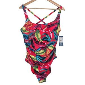 Caribbean Joe Womens 14 Red Tropical Print One Piece Swimsuit NWT