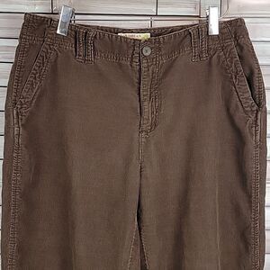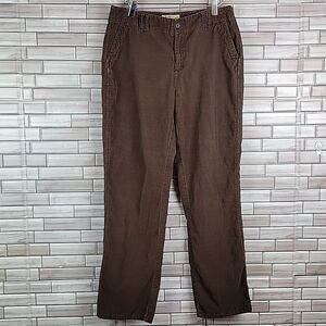 100% cotton small ribbed corduroy pants in brown by Caribbean Joe with two slant pockets in front and two flap back pockets. Good pre-owned condition. Normal signs of wash and wear.