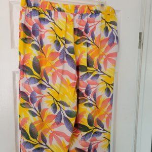 Lightweight, flowy and fun! These Caribbean Joe wide leg cropped pants/capris have two pockets and a tropical leafy pattern. Elastic waist.