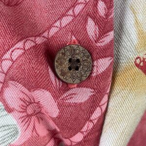Additional Details: Great tropical print, carved design coconut shell buttons, front and back splits on hemline.