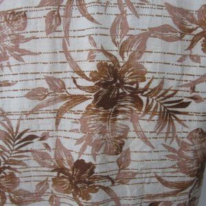 Hawaiian style camp shirt; print features tropical flowers and foliage on a textured fabric
