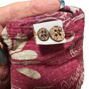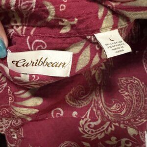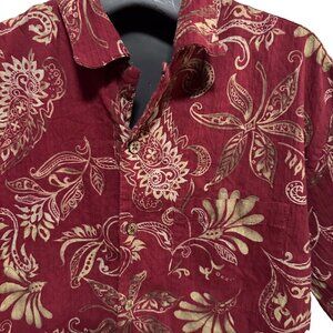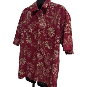 Men’s Large Caribbean short sleeve shirt in maroon with tan & green leaf print. Soft cotton-spandex blend, gently pre-owned. Shoulder 20", Pit to pit 24", Length 30". Lightweight and breathable — perfect for resort, beach, or casual summer wear. Smoke-free home.