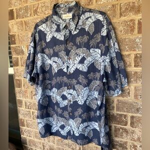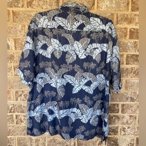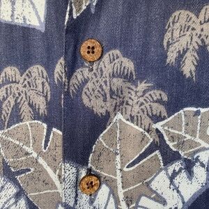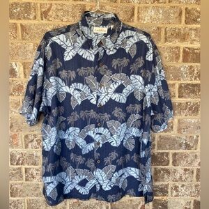 Caribbean size XL button down front vintage short sleeved men’s shirt in a size XL. Armpit to armpit measures 25”. Shoulder to hemline 29 1/2”. 100% rayon herringbone. Machine wash cold. Coconut shell buttons. Gently preowned condition. Palm trees Leaves pattern.