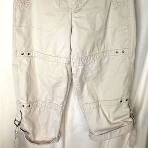 Light tan/khaki Caribbean Joe Capris with roll tab cuffs at the bottom of the legs and two pockets in the front as well as two pockets in the back