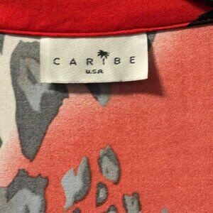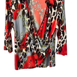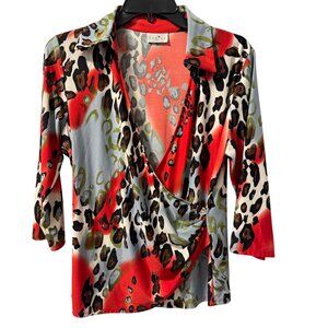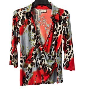 Caribe Womens Animal Print Wrap Top Sz M red multi stretch blouse