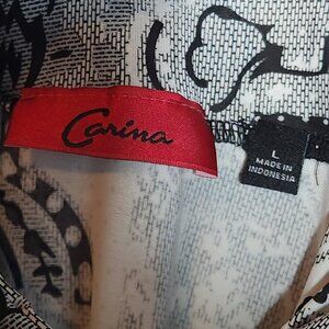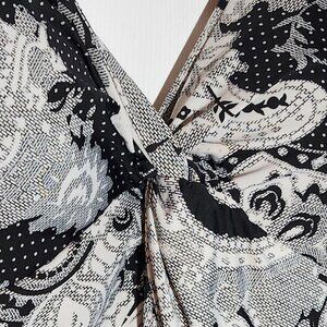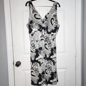 Product Description: Black and white paisley, knee-length, sleeveless, with a V-neckline.