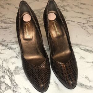 Carisma Brown Pointed Toe Snakeskin Heels size 7. Bronze color leather. Made in Italy. Heel is approximately 4 inches high.