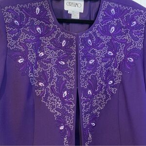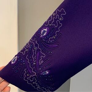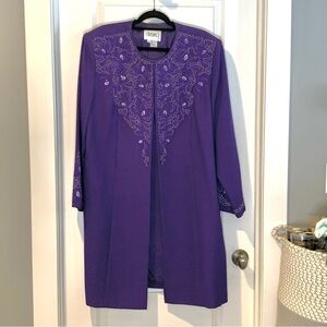 Beautifully Embroidered and Beaded Purple Duster Style 3Pc. Skirt Suit. In Excellent worn once condition. Jacket has hook and eye closures on front should you wan to close it, but it looks great open. Blouse is a sleeveless shell style top in matching color. Skirt is pencil style embellished on the front of the waistband with beading. There is just enough elastic on sides to give it about an inch of stretch. Simply stunning!