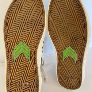 Insole: Mamona oil, bio based cork insert with CARIUMA logo Laces: Made with recycled plastics, and debossed metal aglets Construction: Handmade vulcanized sneaker; fully stitched outsole.
