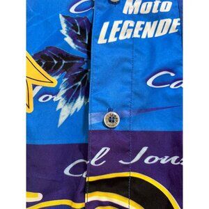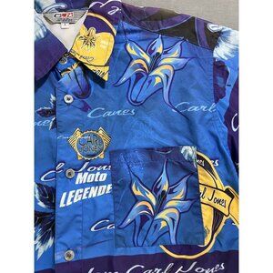 Get ready to hit the road in style with this Carl Jones motorcycle-themed button-up shirt. The shirt features a colorful multicolor pattern with a graphic print of a motorcycle, perfect for any casual occasion. The shirt is made of lightweight woven polyester material, making it suitable for all seasons.
