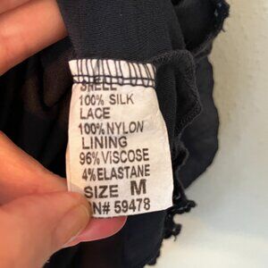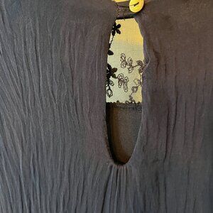 Gorgeous Carla Conti embroidered lace trim top in deep blue, soft and flowy, with floral sheer embroidery at top and pleated bottom over super soft lining, size M. So feminine and sweet. Shoulder to hem measures about 26.5". Made in Italy, silk lace with nylon lining. One button loop closure in back. Very good condition. Smoke-free home.