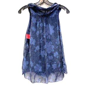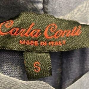 Carla Conti women's navy blue silk print blouse in a size small. Fully lined. Approx 25 inches long and 15 pit-to-pit. In very good preowned condition. Made in Italy. Silk blouse/viscose lining.