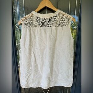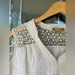 women’s sleeveless top in size medium, featuring a lightweight beige linen blend fabric with delicate crochet lace detailing on the shoulders and upper back. Designed with a split neckline and relaxed fit for breathable comfort. Perfect for summer wear, layering, or casual outings.