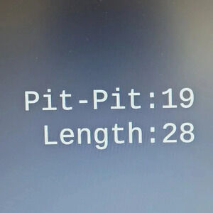 damaged tag. Measurements: pit to pit = 19 inches, length = 28 inches.
