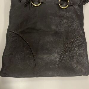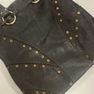 This striking tote bag combines a sleek black leather design with eye-catching brass colored accents, including metal studs arranged in a V-pattern. Its structured shape and double leather straps make it perfect for everyday use, while the tassels add a touch of rocker-chic flair. Some definite signs of use and wear. Some cleaning inside purse and sewing of bottom inside liner as pictured. Still a great bag. From a smoke and pet free home. Some studs are patina or have fallen off as pictured.