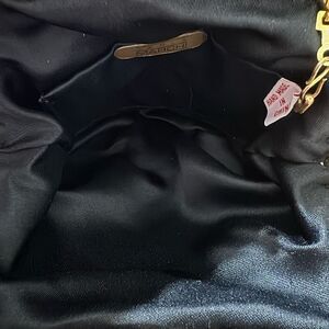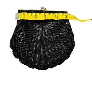 Black beaded scalloped clam shell clutch. Satin lining with a small slip pocket inside. Gold hardware. Vintage. Old Hollywood glamour. The crossbody chain has been removed but still has the hardware inside for a chain to be added if you wish.