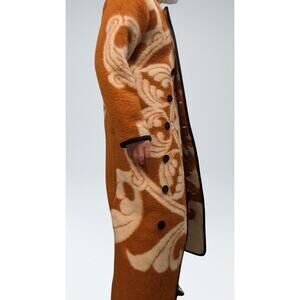 A true statement piece — this stunning Carleen coat is crafted entirely from 100% wool, made from upcycled vintage blankets in rich pumpkin and cream tones. The intricate baroque-inspired pattern gives it both warmth and character, while the black trim and double-breasted silhouette add a modern, structured finish.