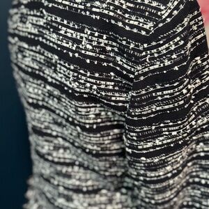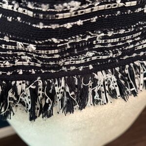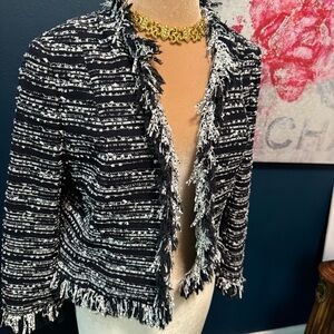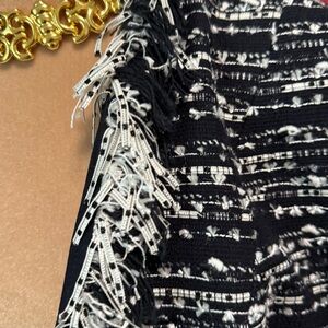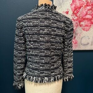 Elevate your style with this chic black and white tweed jacket. Perfect for any occasion, this jacket offers a sophisticated look with its elegant design and fringe detailing.