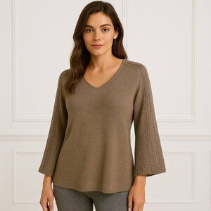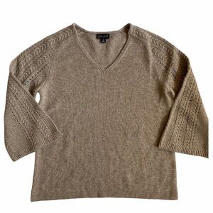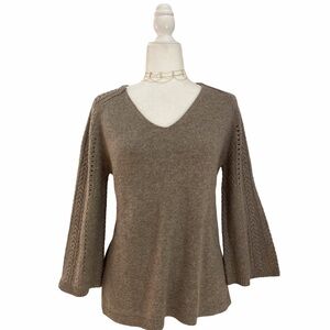 Beautiful Luxe Carlisle Collection Cashmere V Neck Sweater Featuring Crochet Chevron Cableknit Detailed 3/4 Bell Sleeves. Soft and luxurious