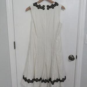 Carlisle Collection white dress with black floral applique. Sleeveless dress with split neckline. Black floral applique around neckline and hem. Dress has pockets that are still sewn in. Fully lined dress.