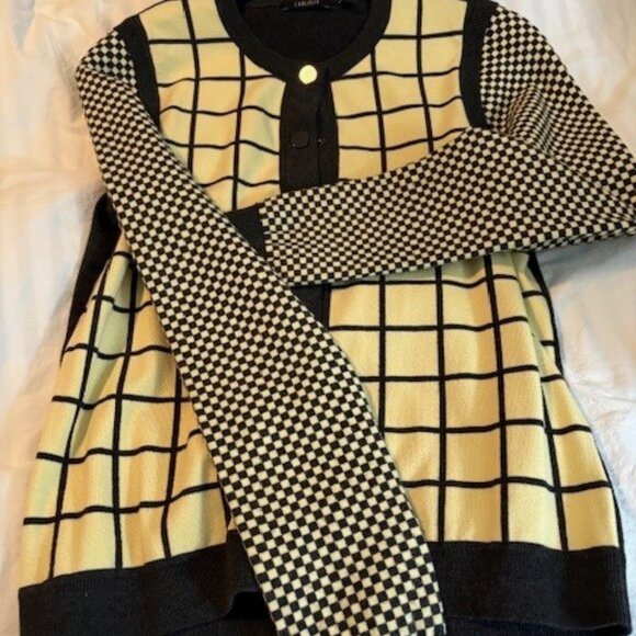 Classic Carlisle cardigan, good condition. Dark gray snap buttons. Sleeves have small checkerboard pattern.