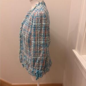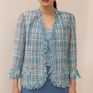 Stylish tweed blazer with fringe details. Perfect for a polished look.