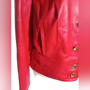 Carlisle Red Genuine Leather Jacket Gold Button Zip Front Classic Blazer Sz 8