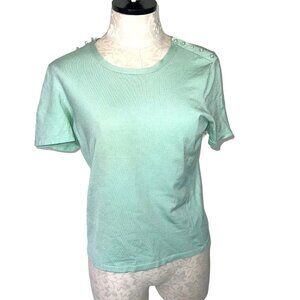 The short sleeve sweater has pearl embellished shoulders and the sweater has pearl buttons.