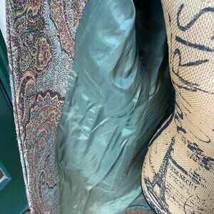 Stunning paisley plaid winter coat in wool and silk. Fully lined in a gorgeous green fabric. Beautifully tailored. I've put too much weight on around the waist or I would never sell it. Perfect length and weight for a city winter coat.