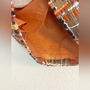 Preppy designer Channel inspired lux tweet mini skirt with fall colors. Beautiful texture tweed in oranges with a real leather trim in brown. Lined in orange fabric. Waist 13.5, hips 19”, length 21”. Excellent vintage condition. Questions? Leave a comment below!