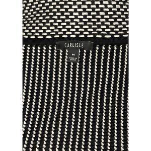 This women's Carlisle black and white collared fitted sweater has a diagonal zipper front. This women's medium sweater shawl has many different black and white designs throughout this top.