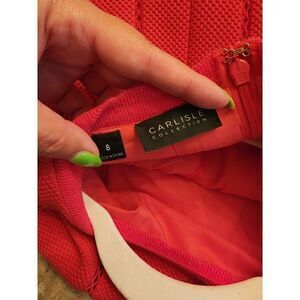 Carlisle Collection red berry/ pink waffle texture dress, zipper back with hook-and-eye closure, scalloped details on short sleeves, fully lined.