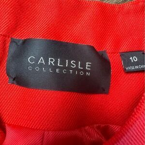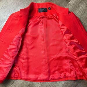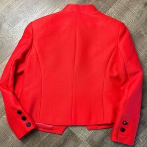 Italian double-weave twill jacket with stand collar. Semi-fitted shape with flattering princess seams. Black horn shank buttons, single breasted front, shoulder pads, and lined in the beatiful same red. Great paired to jeans or leather pants.