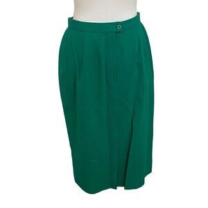 Kelly green midi length wool skirt. Fully lined. Back zip. Inside hook and bar closure and outside button closure. Slit in back. Perfect color for Christmas.