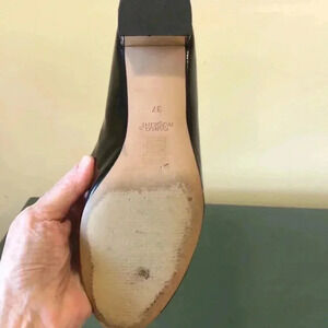 Carlo Pazolini black pumps with gold heel. 9.5” from heel to toe of sole. 3-1/4” wide at widest part of sole. 2” heel. Size 37 EU. US size 6.5-7