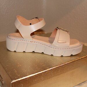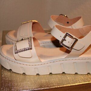 Beautiful leather sandals made in Italy. Taupe with crystal buckle on front strap.