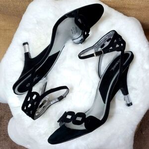Carlos By Carlos Santana, Black Suede Peep Toe Heels (Excellent Condition!) - Super sexy front rounded open toe heels, with gorgeous laser cut-out strap across front, and wrapped around back ankle. Strap wraps around ankle for fastening on the side. Heel measures approximately 4"