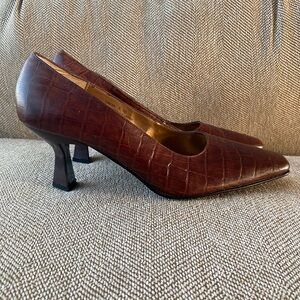 Designer Carlos Falchi Croia mid heel croc pattern is super versatile for any outfit. Wear with Denim, Slacks, Dresses and Skirts. They look great with literally anything and the mid heel size make them so wearable! Carlos Falchi has been around forever, his styles are ALWAYS iconic and unique. Rich Brown Leather. Size 9.5. EUC as pictured.