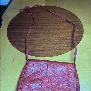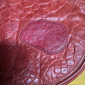 The purse is detailed with Carlos Falchi’s renowned hand-etched patches on the front flap. There is a zipper pocket inside. The front flap closes with a magnetic snap. Some staining inside (pictured)