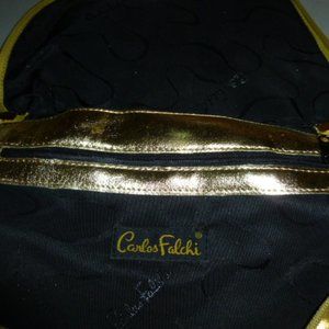 For sale is a Carlos Falchi Gold Backpack Bag. This is an eyecatching bag, as it is quite bright and shiny.