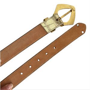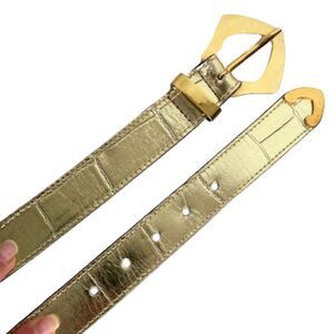 Get noticed in this stunning shiny Carlos Falchi gold metallic leather belt, perfect for any fashion-forward woman. The belt features an embossed alligator/crocodile texture, metal buckle in a unique diamond shape, metal keeper and metal tip. This belt is a must-have for any stylish woman, and it's sure to become a favorite in your wardrobe. Size medium/large. Very good, like new condition!
