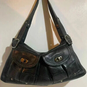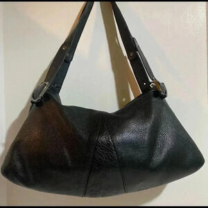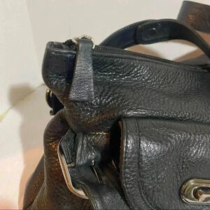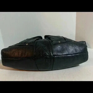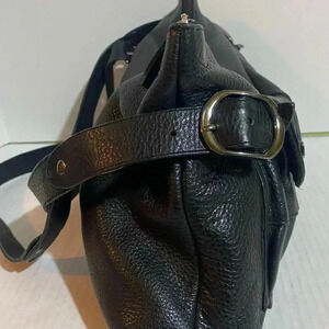 Carlo Mancini black leather satchel handbag with silver tone hardware main compartment 2 pockets at interior wall black satin fabric lining 2 pockets at center inside lining have fixed exterior minor scratches hight 10.5” width 15.5” depth 2.5” strap drop 13” The dimensions are based on approximately measurements before placing an order please check take a moment to view all photos using feature for a closer look